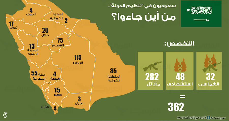 وتأتي الرياض على رأس قائمة المناطق التي التحق منها عناصر بتنظيم "داعش"، إذ ملأ 115 شابا استمارات عضوية، وتليها القصيم بعدد 75 سعوديا، غير أن اللافت في منطقة القصيم هو أن بريدة، وهي أكبر مدن القصيم، التحق منها 60 شابا أي ما نسبته 80 %، وهو ما يراه عبدالعزيز الخضر، مؤلف كتاب "السعودية سيرة دولة ومجتمع"، رقما لافتا، مرجعا الأمر إلى ما يسميه "تراكمات ما بعد هجمات 11 سبتمبر 2001 على نيويورك وواشنطن"، والتي يعني بها تأثر شباب القصيم بشكل عام، بشخصيات متطرفة ومحورية من قيادات تنظيم القاعدة، مثل يوسف العييري، والذي نشط في المنطقة، ما انعكس على الوضع الأمني في بريدة. ويعتبر العييري من القيادات البارزة للقاعدة، وقُتل في مواجهات مع رجال الأمن في السعودية في العام 2003.
