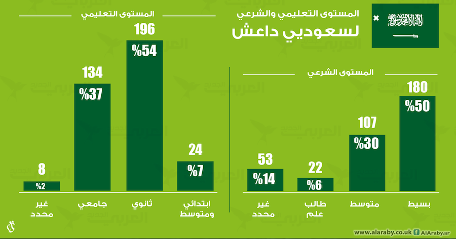تجانس العمر والمستوى التعليمي تكشف استمارات أعضاء داعش السعوديين عن ارتفاع نسبة المتعلمين بينهم، إذ جاء الحاصلون على الشهادة الثانوية في المركز الأول، بإجمالي 54% من الاستمارات، وغير بعيد عنها كانت نسبة الجامعيين 37%، وبلغ عدد الحاصلين على الشهادتين الابتدائية والمتوسطة 7% فقط، بينما لم يحدد 2% من بين المنضمين للتنظيم مستواهم العلمي.
