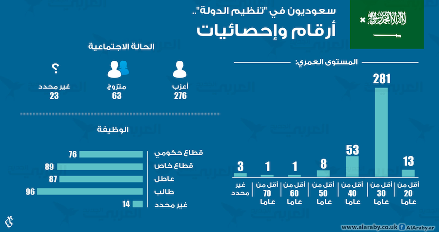 وتتوافق الأرقام السابقة مع المستوى العمري لسعوديي "داعش"، إذ حصل من هم في المرحلة العمرية ما بين الـ20 والـ30، على نسبة 78%، وهو ما يتوافق مع الفترة التي قد يستغرقها الدارسون حتى إنهاء المرحلة الجامعية في السعودية، وفي المركز الثاني جاء من هم في المرحلة العمرية ما بين الـ30 والـ40، بنسبة 15%، وفي المركز الثالث من هم دون العشرين بنسبة 4%، بينما توزعت بقية النسب المئوية على الأعمار التي تفوق 40 عاما فأكثر.
