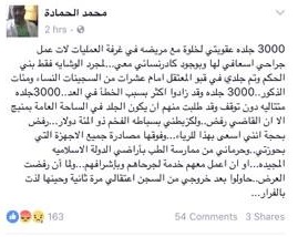 كتب الطبيب “محمد الحمادة” على حسابه في موقع التواصل الاجتماعي، فيسبوك، أن تنظيم داعش قام بجلده بثلاثة آلاف جلدة في مدينة منبج، كعقوبة له بتهمة “الخلو بمريضة في غرفة العمليات، لإجراء عمل جراحي إسعافي”! وتابع “الحمادة” سرد قصته بالقول إن العقوبة بنيت عليه “لمجرد الوشاية، وتم الجلد في قبو المعتقل أمام عشرات من السجينات النساء ومئات الذكور”، وأضاف إن العملية الجراحية التي تمت الوشاية بها على أنها خلوة رغم وجود “كادر نسائي”؛ وذكر “الحمادة” إن العدد زاد عن ثلاثة آلاف جلدة بسبب الخطأ في العد. وقال الطبيب “محمد الحمادة” في منشوره إنه طلب من داعش تنفيذ العقوبة في في الساحة لمدينة “منبج”، إلا أن “القاضي الداعشي” رفض ذلك ووكزه بقدمه بحجة أن “طلبه بسعي الرياء”؛ وصادر التنظيم جميع الأجهزة والمعدات الطبية وقرر حرمانه من ممارسة مهنته في “أراضي الدولة الإسلامية (داعش)”. إلا أن يعمل معهم ويداوي جرحاهم الذين يصابون في معارك التنظيم، فما كان منه إلا أن رفض وذلك قبل إطلاق سراحه وعندما خرج حاولوا اعتقاله، إلا أن الطبيب “محمد الحمادة” آثر الهرب إلى مناطق سيطرة المعارضة في ريف حلب الشمالي، حيث يمارس مهنته. المصدر: الاتحاد برس