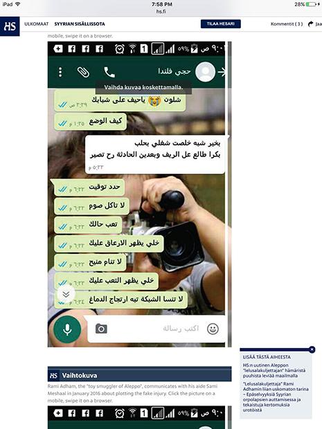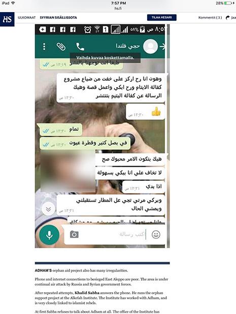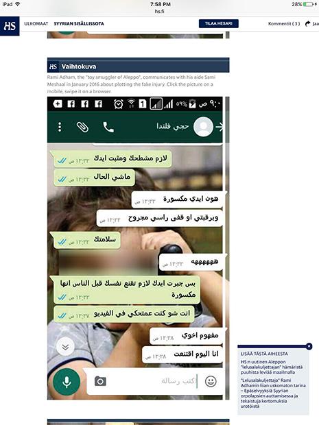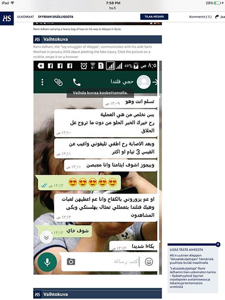هاجر ابن حلب رامي أدهم إلى فنلندا عام ١٩٨٩، عمل في العاصمة هلسنكي وهو أب لستة أولاد، وأسس عام ٢٠١٤ «الرابطة السورية الفنلندية » وهي، كما تعرّف عن نفسها «رابطة مستقلة تسعى الى لمّ شمل السوريين في فنلندا ومد جسور بينهم وبين وطنهم الأم»، ومن بين مهماتها «تقديم الدعم والإغاثة المطلوبة وتوصيلها باليد» إلى السوريين، وأنها «أُنشئت لأنه كان لا بدّ من فعل شيء بعدما قام نظام (الرئيس بشار) الأسد الديكتاتوري بقتل شعبه الذي انتفض ضده بطرق سلمية». وفي الفقرة ذاتها رابط للتبرّع ولـ«حساب الزكاة» يحدد مبلغ الزكاة المطلوب ورقم حساب تحويل الأموال. قناة «يوتيوب» الخاصة بالجمعية تعرض أفلاماً قصيرة من إعداد الرابطة وتقارير متلفزة عن نشاطات أدهم في حلب وكل المقابلات والبرامج التي ظهر فيها الناشط على قنوات فنلندية ودولية. في الشكل كما المضمون يحضر أدهم في غالبية اللقطات المصوّرة التي زوّد بها الإعلام، يرافقه مصوّر يلتقط كل تحرّكاته على طريقة النجوم منذ لحظة مغادرته مطار هلسنكي ثم مع الأطفال الأيتام، وبين الردم في حلب المدمّرة، وهو يزحف أرضاً مختبئاً من قنّاصين، وأثناء عبوره المناطق الحدودية ليلاً... في إحدى المقابلات سألته مذيعة «سي إن إن» عن رد فعل الأطفال لحظة تلقيهم الألعاب؟ فأجاب «... أنا أعمل وحدي وأخاطر بنفسي فقط... تقديم الألعاب هو أفضل ما حصل لي في حياتي». لا شيء عن الأطفال، بل تكرار لمعلومة أنه يزور حلب كل شهرين وقد بلغ عدد زياراته حتى الان ٢٨ رحلة وأنه «لا يبالي بالمخاطر المحدقة به، لان دمه ليس أغلى من دماء الأطفال الذين تخلى عنهم العالم في سوريا». أسَر رامي قلوب الفنلنديين مسؤولين ومواطنين الذين تبرّعوا بسخاء لمشروع كفالة الأيتام في حلب، ثم سحَر الاعلام حول العالم، وبلغت التبرعات لرابطته نحو ٨٠ ألف يورو. لكن، كل ذلك يبدو في طريقه الى الانهيار بعدما نشرت الصحيفة الفنلندية «هلسينغن سانومات» قبل يومين تحقيقاً كشف وجهاً آخر لـ«البطل» وبعض خبايا قصته. الصحيفة ركّزت على ٣ أمور: أولاً، على الصور التي نشرها رامي على حسابه على «فايسبوك» مع الداعية السعودي، وقاضي «جيش الفتح» عبد الله المحيسني، الذي وصفه أدهم بـ«رجل بألف رجل» و«مثال المجاهدين»، إضافة الى تعليقاته المذهبية المتطرفة «ضد الشيعة والأكراد»، كما نقلت الصحيفة. ثانياً، حصلت الصحيفة من المصوّر السوري الذي عمل مع أدهم في حلب، ويدعى سامي مشعل، على محادثات «واتساب» بينهما تبيّن أن أدهم اخترع حادثة تعرّضه للقصف وإصابته بجروح وألّف مع مشعل سيناريو الحادثة وكيفية نشر فصولها تباعاً على صفحة الرابطة على «فايسبوك» لجذب الانتباه مع صور له وهو يدّعي أنه مصاب في رأسه ويده ويقول «قد أزور الأيتام بيدي المجفصنة... أو يزورونني هم وأنا أوزّع عليهم الألعاب... هكذا سيشيّدون لي تمثالاً في هلسنكي وينتحب الجميع» يقول أدهم في إحدى رسائله، قبل أن يتفق مع شريكه بأنه «سيطفئ هاتفه ويختفي عن فايسبوك لمدة ثلاثة أيام ثم يظهر مضمّداً» كجزء من الخطة. الأمر الثالث، عن الاتهامات المتبادلة بين أدهم ومعهد «الكفاح» في حلب - التابع لجماعات إسلامية - الذي كان يتعاون معه في مشروع كفالة الأيتام. يقول أحد مسؤولي المعهد من حلب للصحيفة إنه «طرد أدهم» الذي «بات يتاجر بالأطفال السوريين من أجل الشهرة»، وبعدما «تبيّن أنه لا يرسل المبالغ الصحيحة للأيتام، أي ٣٥ يورو شهرياً لكل يتيم بحسب الاتفاق مع المتبرّعين، بل كان يرسل بين ٩ الى ٢٠ يورو فقط». من جهته، نفى أدهم تلك الادعاءات، وأرسل للصحيفة إيصالات تؤكد أقواله، كما نفى أمر اختراع حادثة إصابته في حلب. لكن، ماذا حلّ بـ٨٠ ألف يورو من التبرعات التي جمعها حتى الآن؟ لا جواب واضحا بعد، سوى فيديو نشره أدهم قبل أسبوعين يشكر فيه المتبرّعين ويقول إنه «سيبني مدرستين بدل الواحدة في سوريا». أعلنت الشرطة الفنلندية أنها باشرت تحقيقات أولية في إمكانية ضلوع رامي أدهم بقضية فساد «بعد شكاوى تقدّم بها مواطنون حول شكوكهم بأن أدهم 