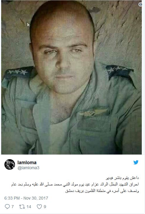 أحرق تنظيم داعش الوهابي الطيار السوري عزام عيد الذي كان قد أسره قبل نحو عام ونصف في القلمون الشرقي.