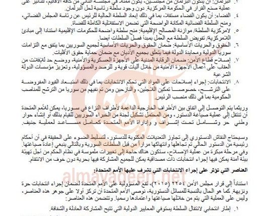 في البند الخامس تحت عنوان “مناقشة الدستور السوري”، ورد تفصيل بشكل مبهم لكنه يدل على مسعى لتقسيم سوريا تحت مسمى “لامركزية السلطة/ موازنة المصالح الاقليمية”، لم تشرح الوثيقة كيفية “موازنة المصالح الاقليمية” لكنّ الحديث في نفس البند عن منح سلطة واضحة للحكومات الإقليمية يوضح أن الهدف هو تحويل سوريا الى ما يشبه الفدرالية.