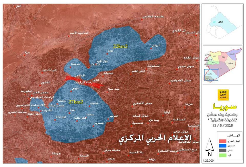 وقالت أن القوات الحكومية تمكنت بذلك من تقسيم مناطق تواجد المسلحين في الغوطة إلى شطرين جنوبي وشمالي، وأكمل تطويق المسلحين في مدينة دوما، أكبر مدينة خاضعة لسيطرة الجماعات الارهابية في المنطقة. من جانبها، ذكرت خلية "الإعلام الحربي المركزي" التابعة لـ"حزب الله" أن وحدات الجيش المتقدمة من مسرابا التقت مع القوات المتواجدة في إدارة المركبات في مدينة حرستا.