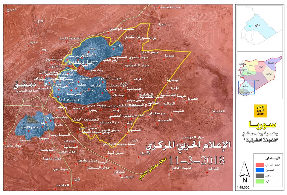 تشرين الثاني 2012 - سيطرت المجموعات الارهابية على مدينة دوما وبعدها تابعت السيطرة على معظم الغوطتين الشرقية والغربية وارتكبت المجازر بحق المدنيين المؤيدين للدولة، وقطعت طريق المطار، واقتربت من اسوار مطار دمشق الشريان الحيوي للمدينة، وقصفت واستهدفت الطائرات المدنية..كل هذه الممارسات كانت تنفذ تحت عنوان الثورة .. نسيان 2018 - خرجت المجموعات الارهابية من الغوطة الشرقية وتحقق الانتصار الكبير والاستراتيجي للجيش السوري ومحور المقاومة..