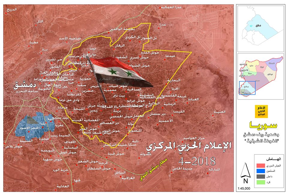 انجاز استراتيجي جديد حققه الجيش السوري في الغوطة الشرقية لدمشق، طويت معه صفحة جديدة من صفحات الإرهاب. إنجاز سيقرأ جيداً في عواصم دول الإقليم الداعم للمسلحين في سوريا، وكذلك في الغرب..فما كان يسمى مشروع "إسقاط دمشق"، ولى إلى غير رجعة، ومعه آمال العديد من الدول التي راهنت على إحداث خرق ما في العاصمة دمشق. ووفق خطة محكمة، تمكنت القوات السورية من تحرير الغوطة الشرقية، بعد إنجاز تحرير مطار أبو الظهور في ريف ادلب واستعادة السيطرة على مساحات شاسعة في أرياف حماة وإدلب وحلب. إنجازات الجيش السوري المتلاحقة خلال الأشهر الأخيرة، أثرت سلباً على معنويات الإرهابيين، خصوصاً وأن منطقة الغوطة كانت تشهد على مدى سنين الأزمة مواجهات ضد الإرهابيين، سيطر خلالها الجيش السوري على العديد من المناطق الهامة.