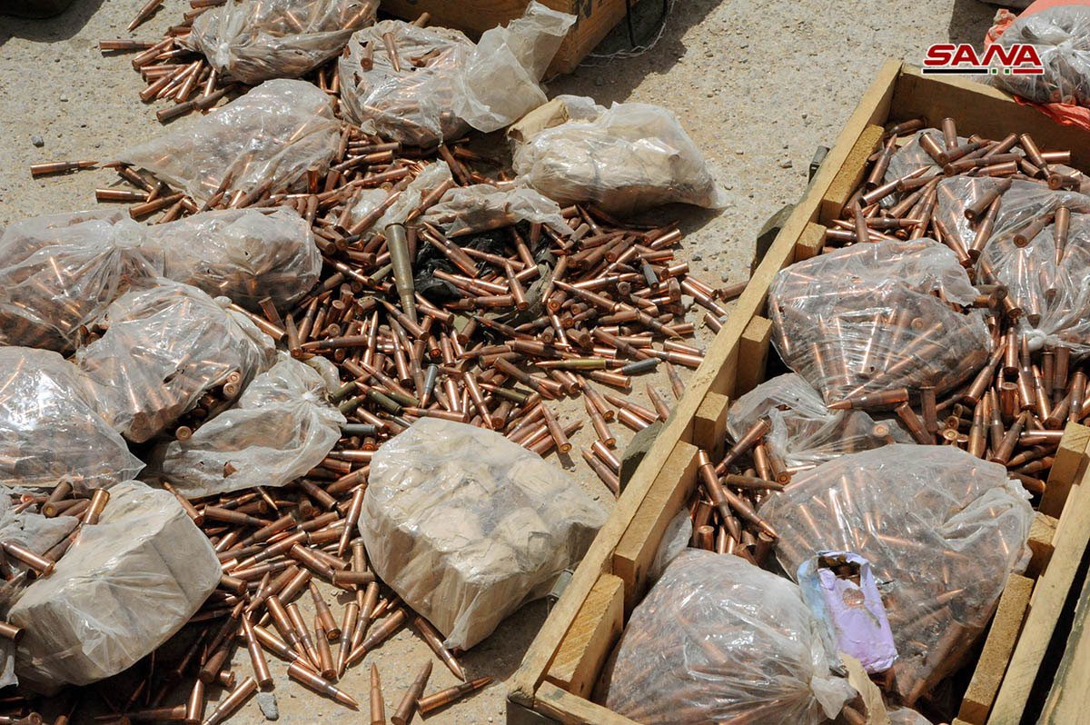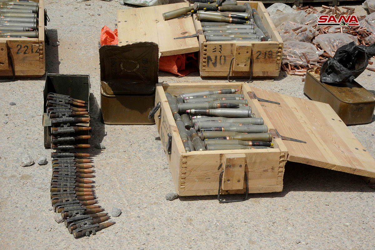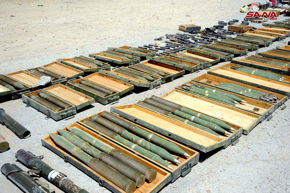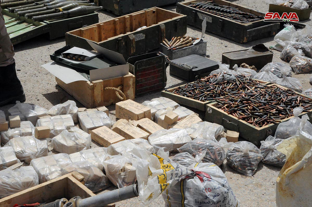 عثرت وحدات من الجيش العربي السوري اثناء تمشيط بلدة الضمير بعد إخراج إرهابيي “جيش الإسلام” إلى جرابلس على كميات كبيرة من الأسلحة والذخائر المتنوعة التي كان إرهابيو التنظيم قد أخفوها في أحد المستودعات في منطقة المحطة بالبلدة. وذكر مراسل سانا الحربي من ريف دمشق أن وحدات من الجيش ضبطت أثناء تمشيطها بلدة الضمير كميات من الأسلحة والذخائر والعتاد الحربي لإرهابيي “جيش الإسلام” في منطقة المحطة جنوب البلدة شملت صواريخ محلية الصنع وصواريخ “غراد” وأعدادا كبيرة من القذائف الصاروخية والهاون وعشرات العبوات الناسفة وقذائف “آر بي جي” وعددا من صواريخ “تاو” الأمريكية والألغام والصفائح المتفجرة وأجهزة تفجير عن بعد ومنصات اطلاق صواريخ محلية الصنع.