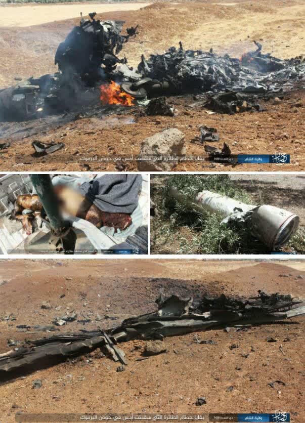 نشر تنظيم داعش الارهابي صورًا علّق عليها قائلًا انها للمقاتلة السورية التي تمّ إسقاطها يوم أمس الثلاثاء من قبل الكيان الاسرائيلي في منطقة هضبة الجولان.