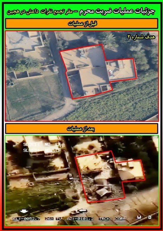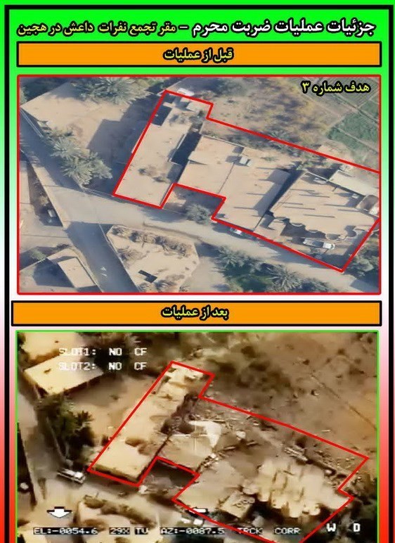 نشرت القوة الجوفضائية في الحرس الثوري الإيراني مجموعة صور للمقرات المدمرة التابعة للمجموعات الإرهابية في هجين بشرق الفرات والتي تم قصفها بواسطة الصواريخ وطائرات الدرون، انتقاماً لعملية مدينة أهواز الإرهابية والتي راح ضحيتها 26 شخصا، بينهم طفل صغير.