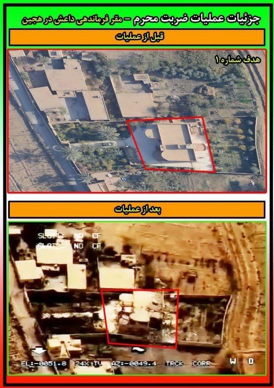 وأشار قال قائد سلاح الجو في الحرس الثوري الإيراني أنه وخلال العملية التي سميت "ضربة محرم" تم استخدام تكتيك مختلف في مجالي الصواريخ وطائرات الدرون، وقال: استخدمنا أساليب استخباراتية خاصة حيث تمت المباغتة بعد التأكد من تواجد قادة المجموعات الإرهابية في المكان.