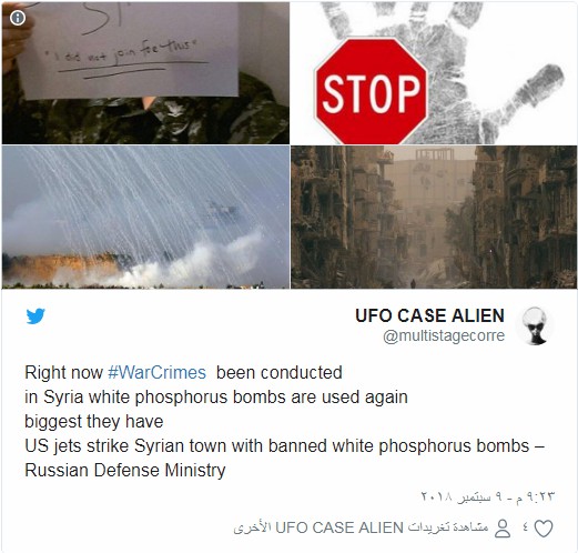 وأفاد المركز الروسي للمصالحة بين الأطراف المتحاربة في سوريا في أوائل سبتمبر الماضي، أن طائرتين أمريكيتين من طراز "إف-15" ضربتا بلدة هجين بالقذائف الفوسفورية ما أدى إلى اشتعال حرائق واسعة، ثم ادعى البنتاغون أنه لم يكن لديه أي ذخيرة من الفسفور الأبيض في الخدمة.