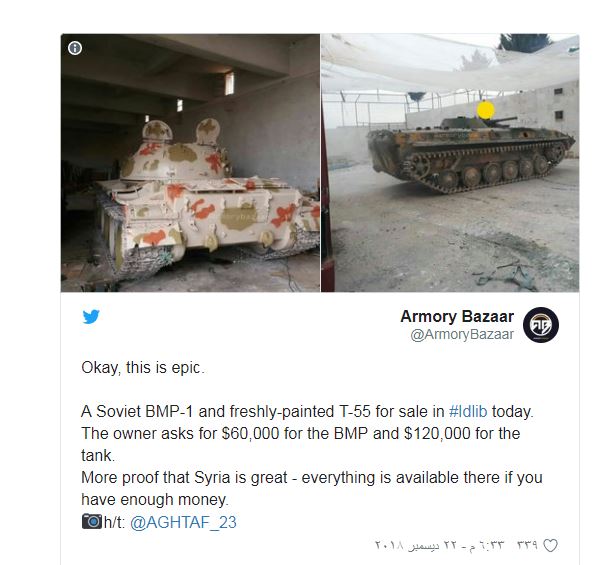 وبات معلوما قبل أيام أن التجار من عناصر المجموعات الإرهابية عرضوا بيع مركبة قتالية مدرعة ودبابة.