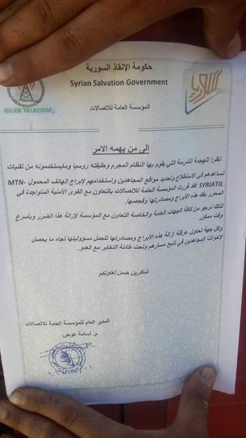أصدرت حكومة الإنقاذ التابعة لجبهة النصرة الإرهابية بياناً أعلنت فيه مصادرتها لأبراج اتصالات الهواتف المحمولة سيرياتيل و MTN في مناطق سيطرتها شمال سوريا وبحسب ما رصد مراسلون ، فقد جاء في نص بيان النصرة الذي نشرته وسائل إعلام المعارضة، أن ” المؤسسة العامة للاتصالات قررت بالتعاون مع قوى الأمن التابعة لحكومة الإنقاذ في المناطق المسيطر عليها أن تفكيك هذه الأبراج و مصادرتها وفحصها”.