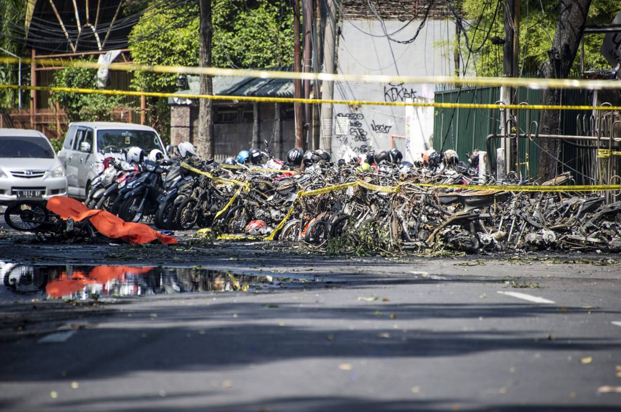 بينما أظهرت صور نشرتها وسائل الاعلام الاحد جثة ممددة امام مدخل كنيسة "سانتا ماريا" الكاثوليكية في سورابايا ودراجات نارية على الارض وسط الانقاض.