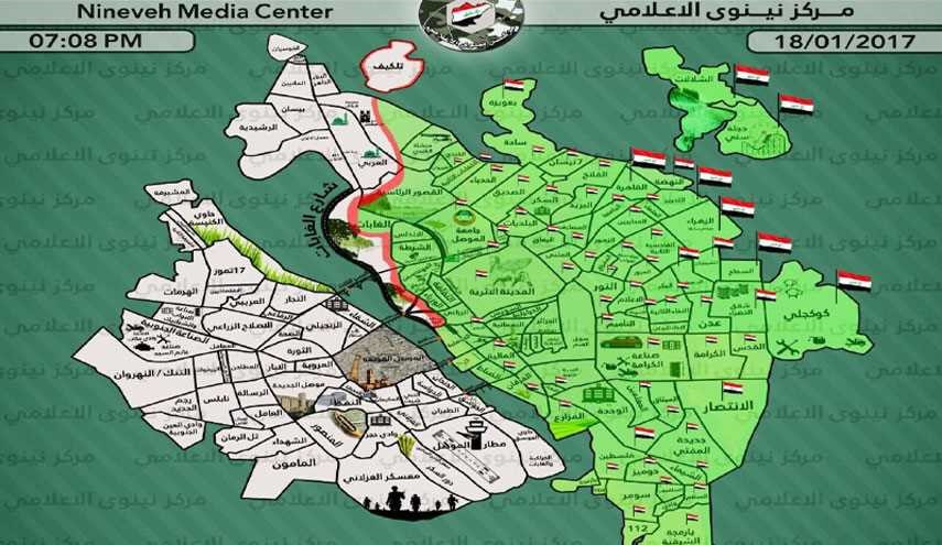 المناطق التي تحمل العلم العراقي هي مناطق تحت سيطرة القوات العراقية... المناطق الخضراء مناطق محررة.. المناطق الحمراء مناطق المواجهة بين داعش والقوات العراقية... المناطق البيضاء مناطق مازالت تخضع لسيطرة داعش.