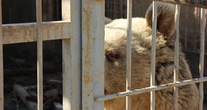 تجلس أنثى دب وحيدة حزينة، وعلى بعد قفصين منها، أسد أرمل فقد لبوته، وسط كومة من الأوساخ والأقفاص الموحشة بعد موت عشرات الحيوانات بمختلف أشكالها بسبب عنف وحصار تنظيم "داعش"، في منتزه في الساحل الأيسر من مدينة الموصل مركز نينوى شمال العراق.