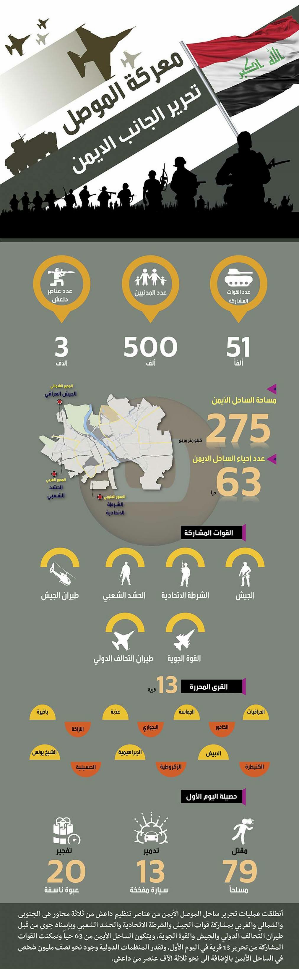 انطلقت عمليات تحرير ساحل الموصل الأيمن من عناصر تنظيم داعش من ثلاثة محاور هي الجنوبي والشمالي والغربي بمشاركة قوات الجيش والشرطة الاتحادية والحشد الشعبي وبإسناد جوي من قبل طيران التحالف الدولي والجيش والقوة الجوية، ويتكون الساحل الأيمن من 63 حياً وتمكنت القوات المشاركة من تحرير 13 قرية في اليوم الأول، وتقدر المنظمات الدولية وجود نحو نصف مليون شخص في الساحل الأيمن بالإضافة الى نحو ثلاثة الآف عنصر من داعش. المصدر: السومرية نيوز