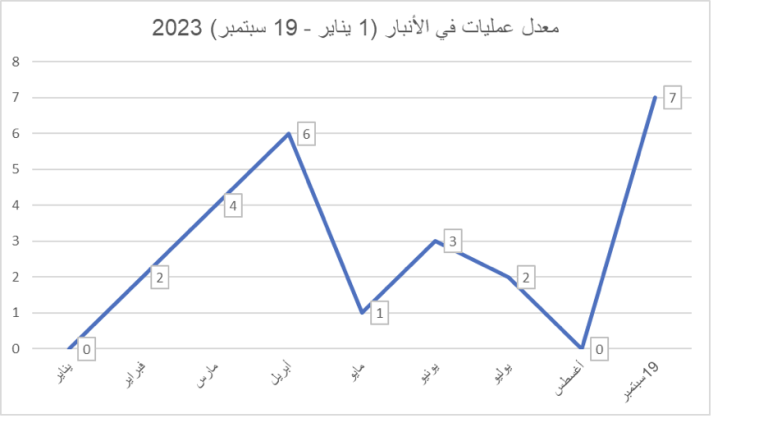 1- اتجاهات النشاط العملياتي جغرافياً: من خلال حصر عمليات التنظيم التي أعلن عنها خلال الفترة 1 يناير – 18 سبتمبر 2023، يتضح أن أعلى معدل للنشاط في محافظة الأنبار خلال الشهر الجاري، في حين كان أعلى معدل في المحافظة خلال شهر أبريل الفائت، بنحو 6 عمليات، وفقاً للمخطط التالي: