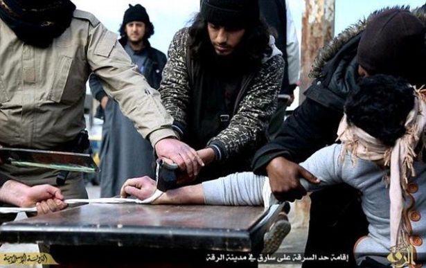 يظهرُ فيديو بثه موقع تابع لـ"داعش" عناصر من التنظيم تعاقب شاباً في الرقة شمال سوريا، بقطع يده أمام حشد من الناس، بعد ادانته بالسرقة. مغمضُ العينين، جلس المحكوم عليه على منصة