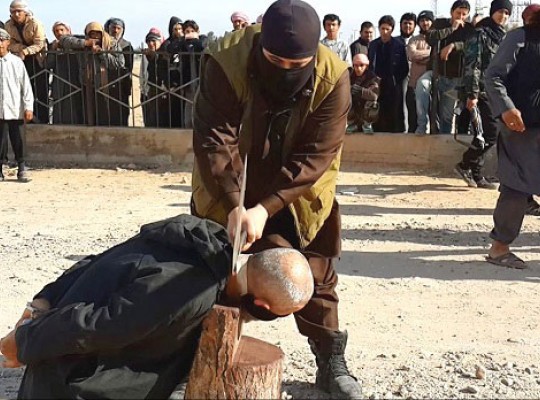 وسط جموع من المواطنين بينهم أطفال في مدينة الرقة السورية قام تنظيم داعش الإرهابي بقطع رأس رجل مسن