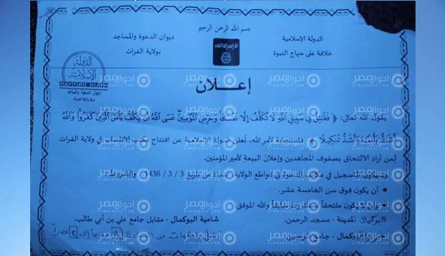 وزعت جماعة "داعش" الارهابي مؤخرا منشورا تعلن فيه عن افتتاح مكتب للانتساب في المنطقة التي تدعوها بـ”ولاية الفرات”، حيث يستقبل المكتب كل من يريد