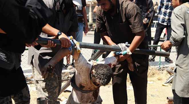 أعدم تنظيم “داعش” 3 عسكريين أسرى تابعين لجيش النظام السوري “ركلاً حتى الموت” على يد أهالي مدينة الرقة، أبرز معاقل التنظيم في سوريا