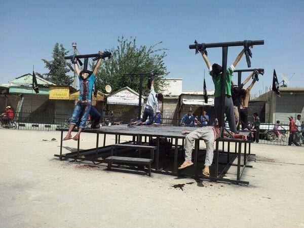 صلب اربعة رجال بينهم مقاتل من النصرة بعد اعدامهم على يد داعش في دير الزور