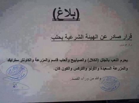 انتشر على موقع التواصل الاجتماعي قرار عن "الهيئة الشرعية" في مركز "الفردوس" بحلب يحرم اللعب بعدة ألعاب منها