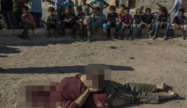اظهر شريط مصور لاحد الهواة على الانترنت مقاتلين من تنظيم "داعش" التكفيري التابع للقاعدة في سوريا وهم يقطعون رأس رجل أمام مرأى حشد من الناس بينهم الكثير من الأطفال