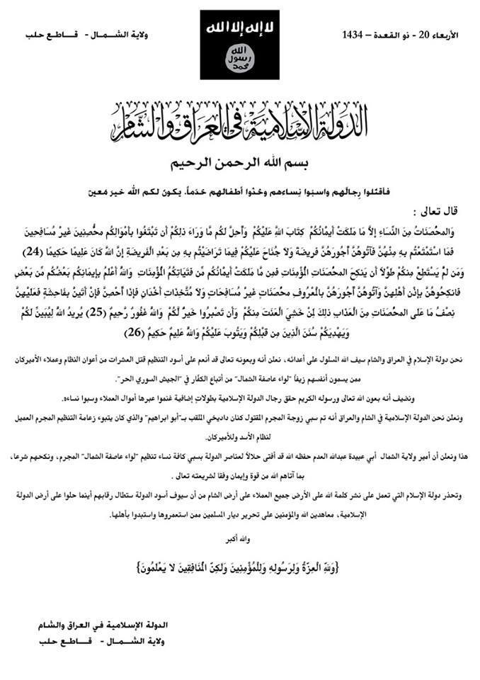 "أمير ولاية الشمال أبي عبيدة عبدالله العدم أفتى حلالاً لعناصر الدولة بسبي كافة نساء تنظيم (لواء عاصفة الشمال) الذي وصفه بـ (المجرم)، ونكحهم شرعا، بما آتاهم الله من قوة وإيمان وفقا لشريعته تعالى"، حسب زعمه .