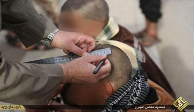 نشرت جماعة "داعش" الإرهابية صوراً لأحد عناصرها وهو يقوم باستخدام مسطرة لتحديد مقاس الجرح المراد فتحه في رأس شخصين، ألقي القبض عليهما لاتهامهما بالقتل.