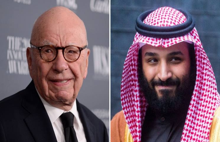 نشر موقع مجلة "هوليود ريبورتر" تقريرا لكل من بيتر كيفر وعابد رحمان قالا فيه إن ولي عهد السعودية محمد بن سلمان أنهى رحلته السريعة إلى لوس أنجلوس بعشاء حميم في قصر الملياردير اليهودي روبرت مردوخ