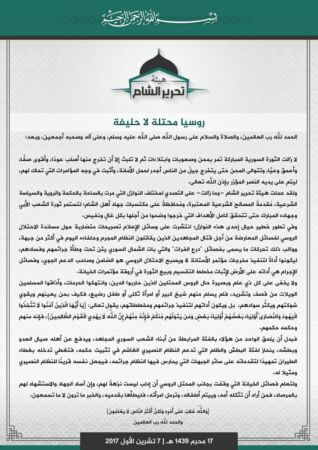 أكدت “هيئة تحرير الشام” أنَّ معركة إدلب لن تكون نزهة لفصائل “الجيش الحر” المنضوية ضمن ”درع الفرات”، التي ستشارك بقتال “الهيئة” في إدلب تحت غطاء جوي روسي، مشيرةً