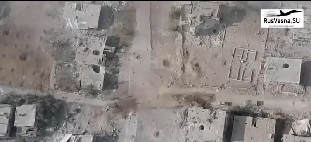 أظهر شريط فيديو رصدته طائره مسيرة لحظة سقوط صاروخ طائرة روسية على مجموعة من "داعش" وذلك خلال فرارها من إحدى النقاط المتقدمة في مخيم اليرموك
